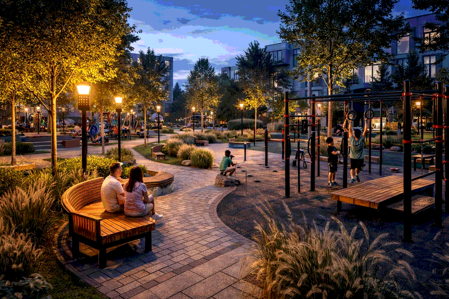 Зелёные зоны, вода, натуральные материалы, тёплый свет и удобная уличная мебель создают ощущение уюта и безопасности.
