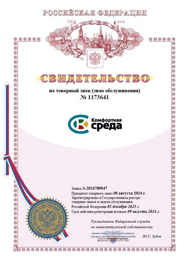 Федеральная служба по интеллектуальной собственности зарегистрировала логотип «Комфортной среды» как товарный знак. Свидетельство № 1173641 выдано на основании заявки № 2024789047, приоритет от 09 августа 2024 года. Регистрация действует до 09 августа 2034 года.